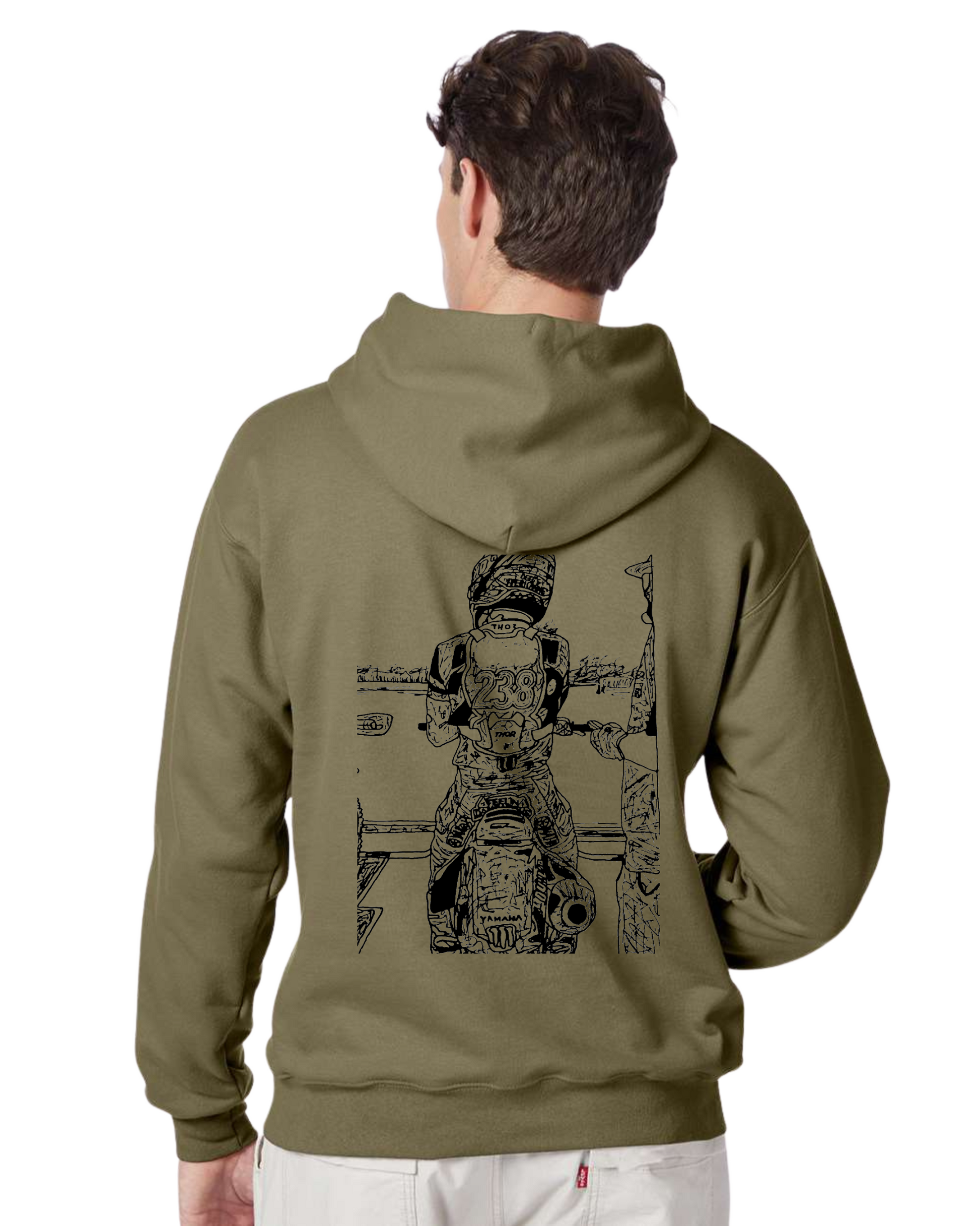 A rider’s perspective, drawn from the rear seat, showcasing number #238 charging toward the unknown. This artwork reflects the determination and focus of every racer at the start line. Raya’s hand-drawn lines bring the grit of motocross to life, making this hoodie a true statement of perseverance and drive. Perfect for motocross lovers, adrenaline chasers, and anyone who wants a unique streetwear look. The hoodie’s softness and resilience make it a go-to for both active and casual wear.